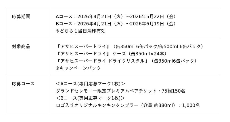 4月21日からは「MUSIC AWARDS JAPAN 2026」授賞式に参加できるチケットなどが当たるキャンペーンを実施します。同日から発売する対象のキャンペーンパックを購入して応募すると抽選で、グランドセレモニーの限定プレミアムペアチケットが75組150名に、また「MUSIC AWARDS JAPAN 2026」ロゴ入りのオリジナルキンキンタンブラーが1,000名に当たります。