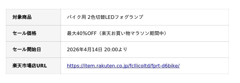 車・バイク用カスタムパーツ専門店エフシーエル(fcl.)を展開する株式会社WiNEEDS HOLDINGS(所在地:広島市南区京橋町1-7 アスティ広島京橋ビルディング7F、代表取締役社長:尾田 雅史)は、2026年4月14日(火)20:00より、楽天市場店にて開催される「楽天お買い物マラソン」において、バイク用2色切替LEDフォグランプを主軸とした安全啓発キャンペーンを実施し、最大40%OFFの特別販売を開始いたします。