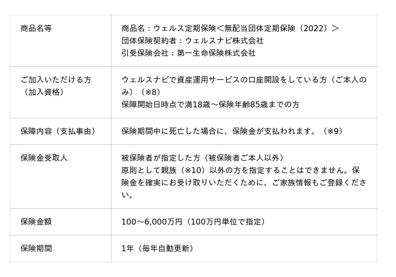 ※8 加入者がウェルスナビの資産運用サービスの口座を解約した場合、当商品から自動的に脱退となり、保障が終了します。