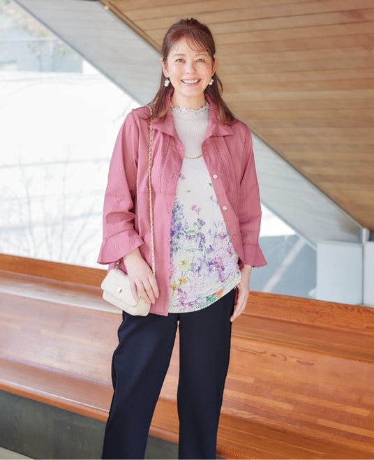 ・綺麗なピンク色のシャツと、花柄のパネルプリントのプルオーバーが華やかで写真映えするコーディネートです。