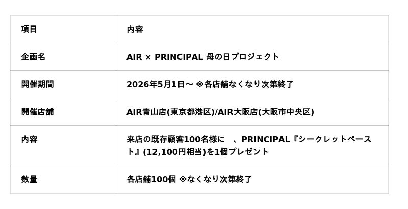 AIR青山店・AIR大阪店にて「母であり働く女性」を対象に、来店の既存顧客100名限定『シークレットペースト』を無料プレゼント。(2026年5月1日より開始)