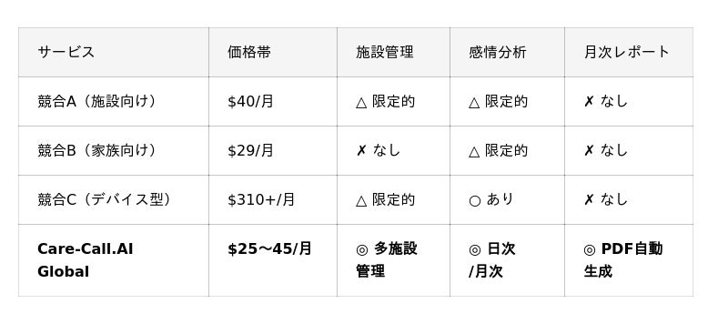 下表の通り、既存サービスは存在するものの、施設管理機能・家族ダッシュボード・感情分析・月次レポートを統合した「B2Bプラットフォーム」の空白が明確に存在します。