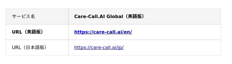 ※ https://care-call.ai へアクセスすると、ブラウザの言語設定に基づき日本語版・英語版へ自動的に振り分けられます。