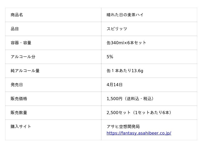 アサヒビール株式会社(本社 東京、社長 松山一雄)は、麦茶で焼酎を割った缶チューハイ『晴れた日の麦茶ハイ』を新商品テスト販売サイト「アサヒ空想開発局」で4月14日から数量限定で発売します。