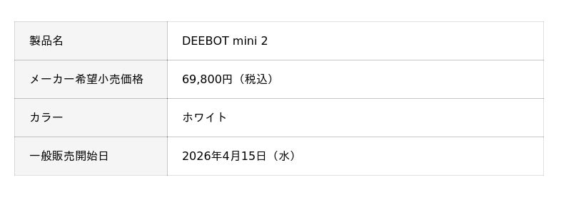 研究開発から製造、販売までを一貫して行い、家庭用ロボットをグローバルに展開する総合メーカー、エコバックスジャパン株式会社(本社:東京都千代田区、社長:梅田永智)は、2026年4月15日(水)からコンパクト設計と高機能を両立したオールインワンロボット掃除機「DEEBOT mini 2」を発売いたします。本製品は、直径約28.6cmのコンパクトサイズで家具のすき間や狭い場所にもスムーズに入り込みながら、最大10,000Paのパワフルな吸引力と水拭き機能で、床のホコリから汚れまでしっかりきれいにします。さらに、部屋の形を把握して効率よく動き、毛の絡まりも抑える設計で、毎日の掃除を手間なく快適にサポートします。