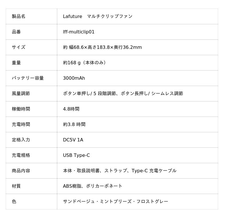 – クリップ:日傘・衣服・バッグに固定してハンズフリー。