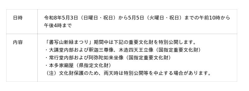 新緑が芽吹く書写山で、「書写山新緑まつり」を開催します。期間中は国指定重要文化財や県指定文化財の特別公開を行います。鮮やかな新緑が山を彩り、心も体もリフレッシュできるひとときを、ぜひお楽しみください。