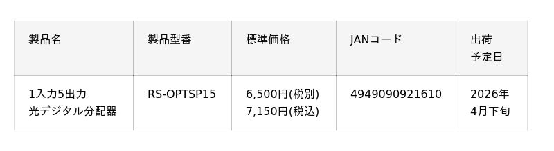 ラトックシステム株式会社(本社:大阪府大阪市西区、代表取締役:近藤 正和、以下ラトックシステム)は、1入力5出力に対応した光デジタル分配器を、4月下旬より出荷開始いたします。
