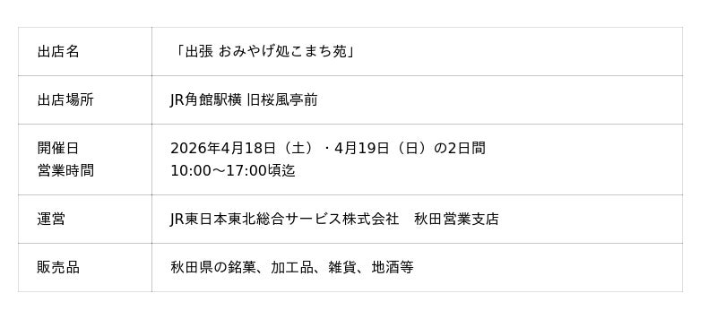 JR秋田駅2階で土産物販売店「おみやげ処 こまち苑」を運営するJR東日本東北総合サービス株式会社(本社:宮城県仙台市、代表取締役社長:弭間 俊則)は、2026年4月18日(土)~19日(日)にJR角館駅で「出張 おみやげ処 こまち苑」を開催します。秋田県内のお土産や雑貨、地酒などを販売し、角館にお越しのお客さまに秋田の魅力を存分にお届けします。皆さまのご来場を心よりお待ちしております。