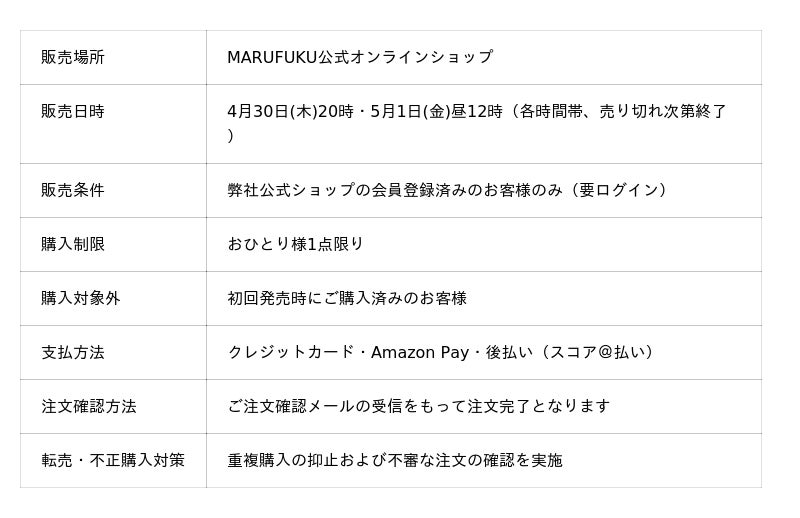 本商品は2026年2月27日の発表以降、想定を大きく上回る反響をいただき、3月3日に発売した初回販売分は早期に完売となりました。初回販売数につきましては、丸福繊維としても初の取り組みとなる商品のため、慎重なロット設定でのスタートといたしました。しかしながら結果として、多くのお客様にご不便とご迷惑をおかけする形となってしまったことを深く反省し、ご購入を希望されていたにもかかわらずお求めいただけなかったお客様には、心よりお詫び申し上げます。