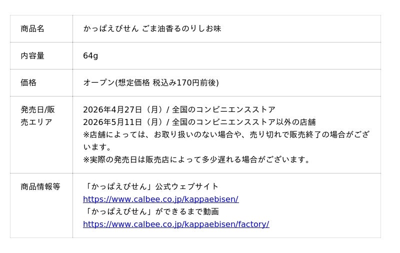 カルビー株式会社(本社:東京都千代田区、代表取締役社長兼CEO:江原 信)は“やめられない、とまらない♪”でおなじみのロングセラー商品「かっぱえびせん」より、青のりと焼きのりの2種類の「のり」に、香ばしいごま油を加えた『かっぱえびせん ごま油香るのりしお味』を2026年4月27日(月)から全国のコンビニエンスストア先行で期間限定発売します。コンビニエンスストア以外の店舗では、2026年5月11日(月)から発売します。