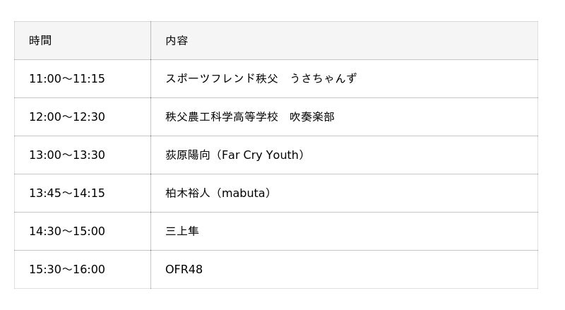 地元「秩父農工科学高等学校」による吹奏楽演奏や「宮地太鼓連」の秩父屋台囃子、「スポーツフレンド秩父 うさちゃんず」の躍動感あふれるダンス、さらにはデビュー15周年の三上隼をはじめ、柏木裕人(mabuta)、荻原陽向(Far Cry Youth)らアーティストのほか、お風呂屋さんで働くスタッフで構成された話題のアイドルグループ“OFR48”が登場します。