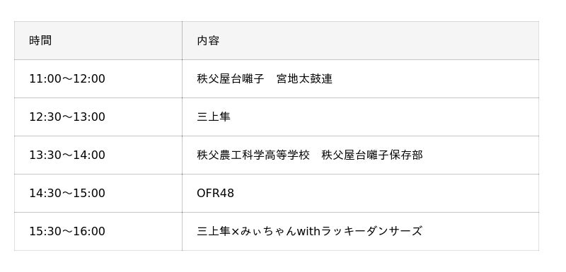 さらにステージでは、秩父を体感できる多彩な出演者がラインナップ。地元の高校生の演奏や伝統芸能パフォーマンスをはじめ、デビュー15周年を迎えた秩父出身のシンガーソングライター“三上隼”などの実力派アーティストやお風呂屋さんで働くスタッフで構成されたアイドルグループ“OFR48”のライブといった地元の伝統と次世代のエネルギーが融合した豪華ステージをお楽しみいただけます。