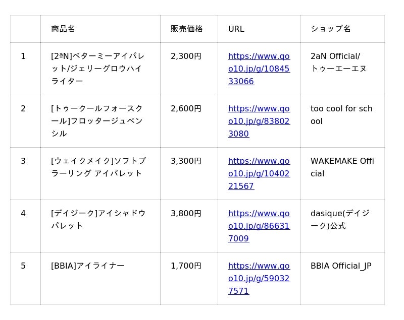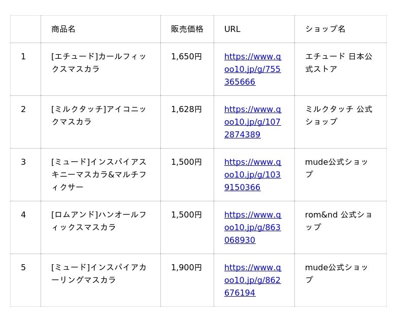 Qoo10(https://www.qoo10.jp/)サイト上、「マスカラ」「リップメイク」「アイシャドウ」「チーク」カテゴリーの公式ショップ各販売個数に基づいたランキングです。