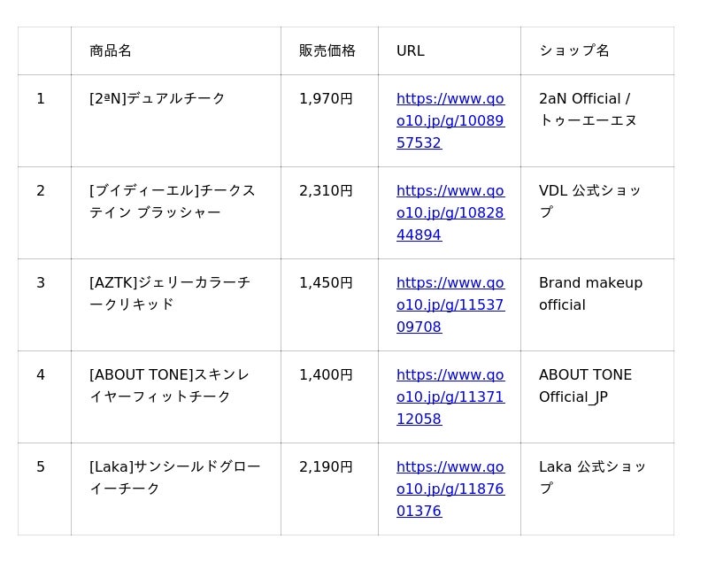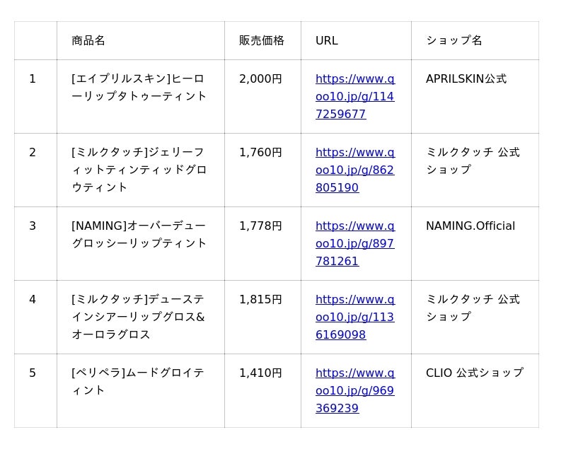 インターネット総合ショッピングモール「Qoo10」を運営するeBay Japan合同会社(本社:東京都港区、代表取締役:グ ジャヒョン)は、Qoo10で人気のコスメカテゴリーの中から、『リップ』『アイシャドウ』『チーク』と、月替わりで1アイテムをピックアップした、月間販売数TOP5※をご紹介していきます。