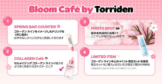 マルマンH&B株式会社(本社:東京都千代田区、代表取締役社長:溝田 勝彦)が展開する韓国スキンケアブランド「Torriden(トリデン)」は、2026年4月29日(水・祝)~5月10日(日)の期間限定で、渋谷「OPENBASE SHIBUYA」にて桜とピンクをテーマとしたポップアップストア『Bloom Cafe by Torriden』をオープンいたします。本ポップアップストアではセルメイジング コラーゲン※1 ラインのピンクをモチーフにしたドリンクの提供や店内でお花見ができるダイナミックな桜の木の設置、新商品を含む限定セットの販売をいたします。