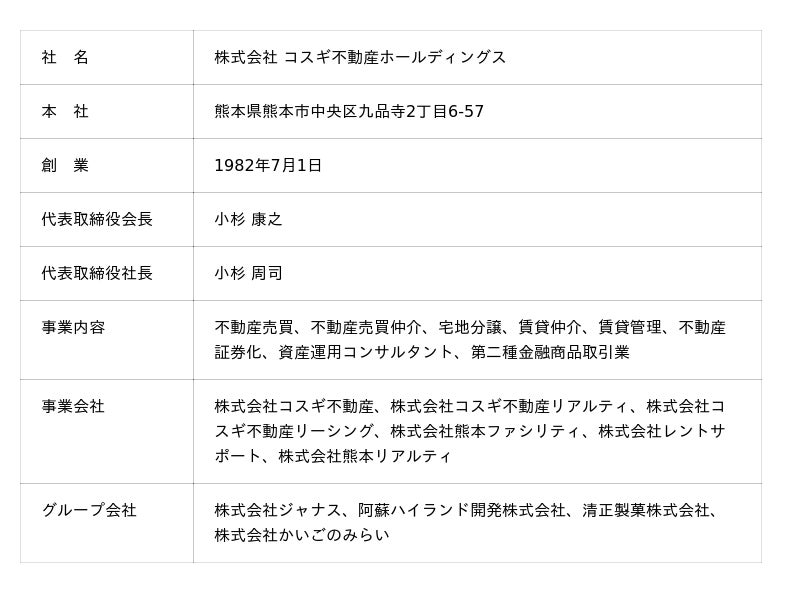 グループ会社:ジャナス(商業ビル管理・仲介)、阿蘇ハイランド開発(複合リゾート運営)、かいごのみらい(認知症高齢者グループホーム運営)、清正製菓(お菓子の製造・販売・卸)を展開。