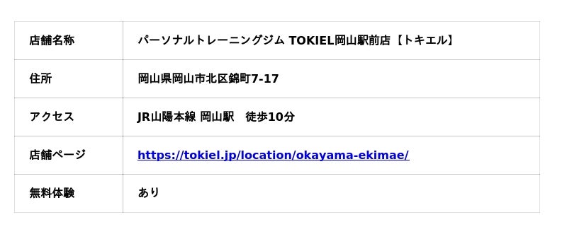 「運動習慣をつけ、美しく健康な身体に導く」がコンセプトのパーソナルトレーニングジム『TOKIEL 【トキエル】』を展開する株式会社TIU(本社:東京都台東区、代表取締役 篠田拓也)は、2026年5月1日にJR山陽本線 「岡山」駅 徒歩10分(住所:〒700-0902 岡山県岡山市北区錦町7-17)に『パーソナルトレーニングジム TOKIEL岡山駅前店【トキエル】』がオープン。