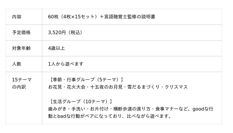 今回開発する「おはなしづくりカード」は現役の言語聴覚士が監修。日常生活に即した4コマ構成のカードで、語彙が少ないお子さんでも無理なく取り組めます。