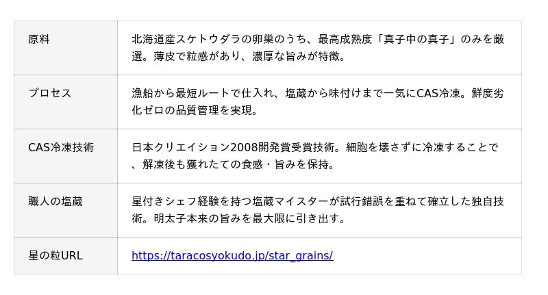 一方、「星の粒」は、北海道産の最高品質「真子(まこ)」のみを使用し、CAS冷凍技術(医療分野でも採用される細胞を壊さない冷凍技術)と30年以上のベテランスタッフによる独自の塩蔵技術を組み合わせた、数量限定のプレミアム辛子明太子です。1瓶7,500円(税込・送料無料)という価格帯でありながら、その粒感・旨み・食感は従来の明太子の概念を一新すると高い評価を受けています。