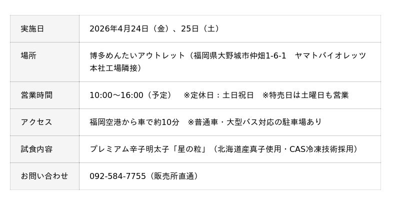 株式会社ヤマトバイオレッツ(本社:福岡県大野城市/ふくやグループ/代表取締役:梁川 剛一)は、工場直売所「博多めんたいアウトレット」において、当社が誇るプレミアム辛子明太子「星の粒」の試食提供を、2026年4月24日(金)・25日(土)の2日間で実施いたします。
