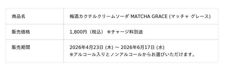チョーヤ梅酒株式会社 (本社:大阪府羽曳野市、社長:金銅重弘、以下チョーヤ) は、梅酒カクテル専門店「The CHOYA 銀座BAR (ザ チョーヤ ギンザバー) 」にて、紀州産南高梅100%の梅酒をベースに日本産の抹茶をふんだんに使用した梅酒カクテルクリームソーダ「MATCHA GRACE (マッチャ グレース) 」を2026年4月23日 (木) から2026年6月17日 (水) まで期間限定で販売します。