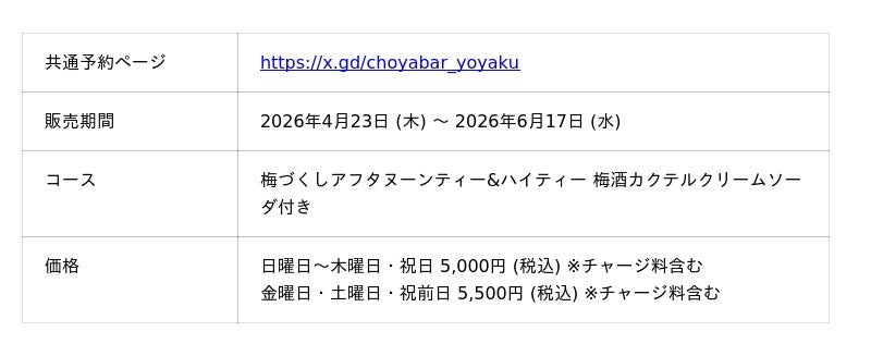 ■2026年4月23日~2026年6月17日100種類以上のドリンクが飲み放題!梅づくしアフタヌーンティーのデザートに!(予約URL: https://x.gd/choyabar_yoyaku)