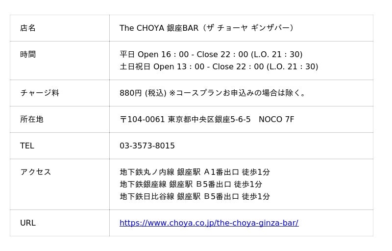 The CHOYA 銀座BARでは、お客様に「常に梅との新しい出会い」をお届けする事をコンセプトにこれからも運営して参ります。梅気分の際には、お気軽にお立ち寄りください。