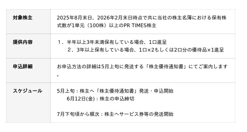 プレスリリース配信サービス「PR TIMES」等を運営する株式会社PR TIMES(東京都港区、代表取締役:山口拓己、東証プライム・名証プレミア:3922)は2026年4月20日(月)、株主優待制度を活用した“顧客と株主がつながる”プログラム2026年版において、対象株主(*1)へ進呈する商品・サービスを決定いたしました。対象株主には申し込み方法を記載した「株主優待通知書」を5月上旬から順次郵送でお送りいたします。優待の申込締切は6月12日(金)です。