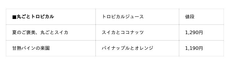 ”丸ごとトロピカル”はパイナップル、スイカを使ったトロピカルジュースとなります。