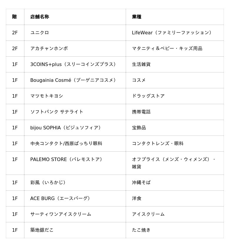 今回は、昨年の「食品館」「無印良品」などの改装に続く大幅リニューアルとなっております。ファミリーファッションの「ユニクロ」や生活雑貨の「3COINS+plus」に加えて、沖縄県3店舗目となるマタニティ&ベビー・キッズ用品の専門店「アカチャンホンポ」、当社初のコスメショップ「Bougainia Cosme」(ブーゲニアコスメ)のほか、ドラッグストアの「マツモトキヨシ」などが出店いたします。