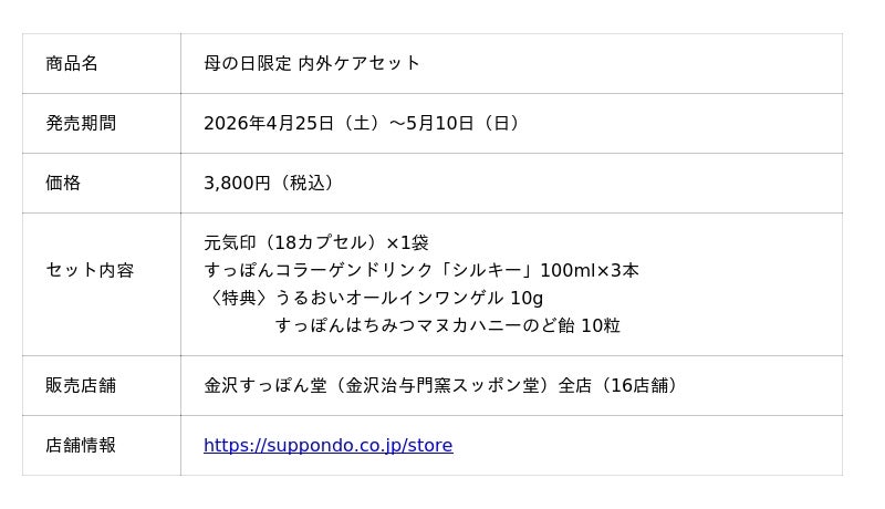 天然・自然由来の和漢素材にこだわった健康補助食品の販売を行う株式会社金沢すっぽん堂本舗(所在地:石川県金沢市、代表:墨屋太郎)は、母の日の贈り物として「母の日限定 内外ケアセット」を、2026年4月25日(土)から5月10日(日)まで、全国の直営16店舗にて期間限定で販売します。