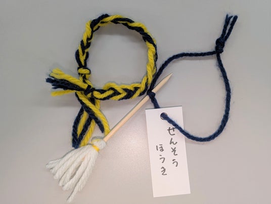 中継後は、ワークショップを開催します。毛糸と竹串でのマスコット「せんそうほうき」を手作りし、争いごとを掃き去り戦争放棄を誓います。ウクライナ国旗の青と黄色で作るミサンガは、世界で起きている戦禍を他人事として忘れないよう身に付けます。