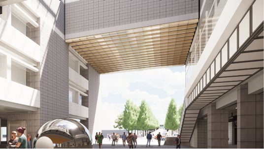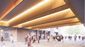 本リニューアル工事では、日吉という街の特徴であるイチョウ並木をコンセプトに、駅・駅ビルと街の繋がりを目指しました。イチョウの葉をモチーフとしたデザインや半鏡面のアルミパネルにイチョウ並木や人の往来を柔らかく映し込むような仕掛けづくりを行い、街との連続性を意識した計画としています。また、一部には神奈川県産材の杉を使用するなど地域素材を活用しています。