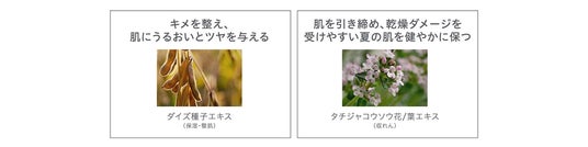 肌にうるおいを与える植物エキスや、肌を引き締め、冷房などによる乾燥ダメージを受けやすい夏の肌を健やかに保つ植物エキスを贅沢に配合しています。