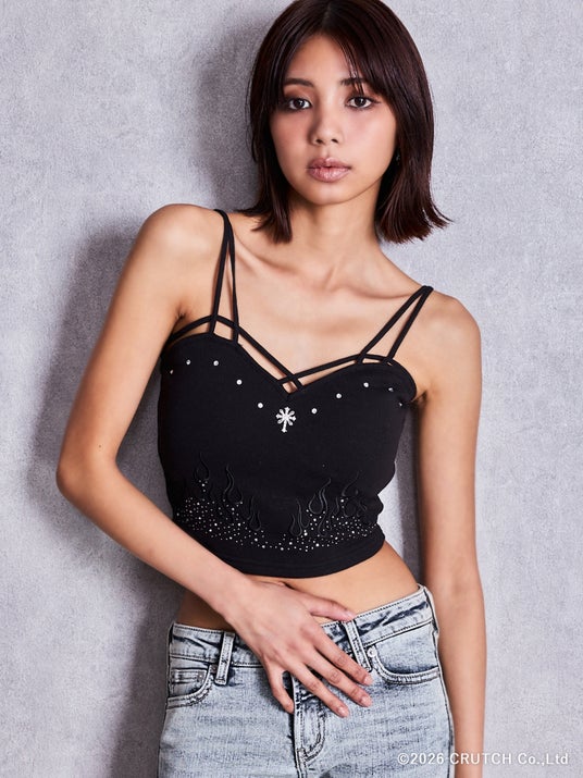 コラボ限定デザインのハイビスカスをつけたキャンディガルフィーがインパクトのあるレオパード柄セットアップをはじめ、クロスモチーフ、ファイヤーパターンでコラボレーション感あふれるビスチェ、ビジューとコラボレーションロゴのワッペンが気分を上げてくれるデニムショートパンツなど、全6型を展開します 。