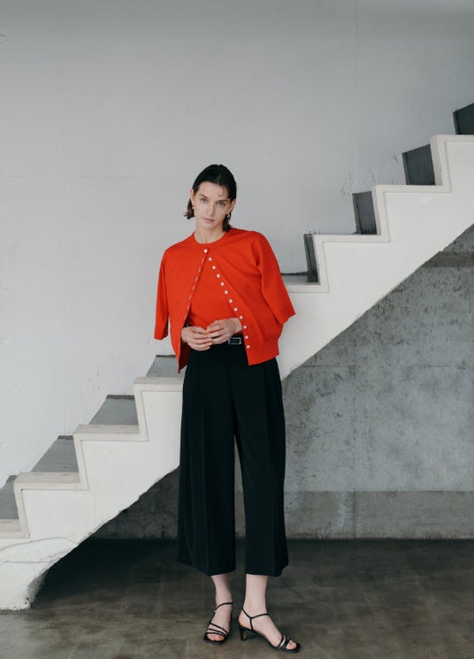 初夏へ向かうこの時期に、色や柄がもたらす前向きなムードを取り入れて。クロップドワイドパンツの新しい丈バランスを軸に、配色ニットやスカーフプリント、ボーダーのパターンをミックスして、華やかさと今年らしさを両立したスタイルを提案します。シーズンカラーに赤を効かせることで、都会的で品のある今の空気感を表現します。