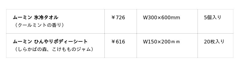 「氷冷タオル」は30×60cmの首にかけられる大判サイズ。清涼成分メントール配合で屋外での暑さ対策におすすめです。「ひんやりボディーシート」はムーミン谷をイメージした「しらかばの森」と「こけもものジャム」がふんわりと香り、やわらか厚手シートで汗やベタつきをしっかり拭き取ります。