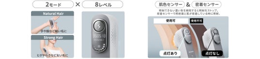 本機は、業務用美容機器の技術を応用した冷却機能「JeweL冷却」を搭載しました。照射面には光透過率が高く、冷たさをすばやく伝えるサファイアクリスタルを採用。光を効率よく肌に届けながら、照射面を約10℃まで冷却することでハイパワー照射でも刺激を抑えたケアが可能です。脚の毛にも、約2週間の使用による効果実感を確認しています。また、最速で毎秒2.5回(※3)のスピーディーな連続照射に対応し、短時間で効率よくお手入れができます。さらに「Strong Hairモード」「Natural Hairモード」の2つのモードと、各モード8段階の出力設定により、肌の状態や部位に合わせて細かく調整できます。これらの機能により、自宅で手軽にできる、プロ仕様の高品質なムダ毛ケアを提供します。