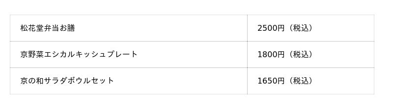 メニュー名・価格(一部)