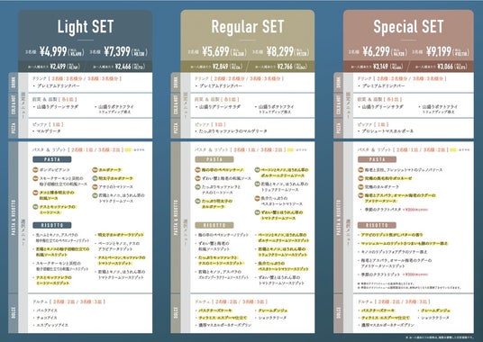 前菜からメイン、ドルチェまで完結する3つの新セットプラン、お得なセット「ライト」「レギュラー」「スペシャル」の提供を開始いたします。