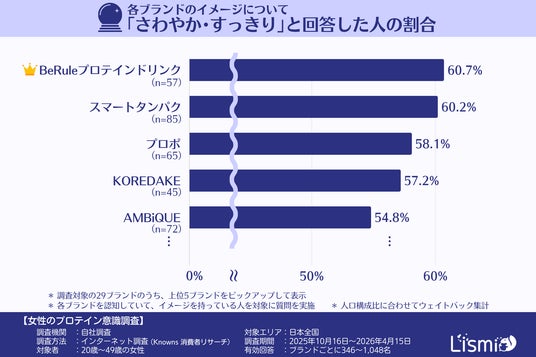 「さわやか・すっきり」というイメージが当てはまると回答した割合は、『BeRuleプロテインドリンク』が60.7%で最も高く、これに『スマートタンパク』が60.2%と僅差で続いています。さらに、『プロポ(Propo)』が58.1%、『KOREDAKE』が57.2%、『AMBiQUE』が54.8%という結果となりました。