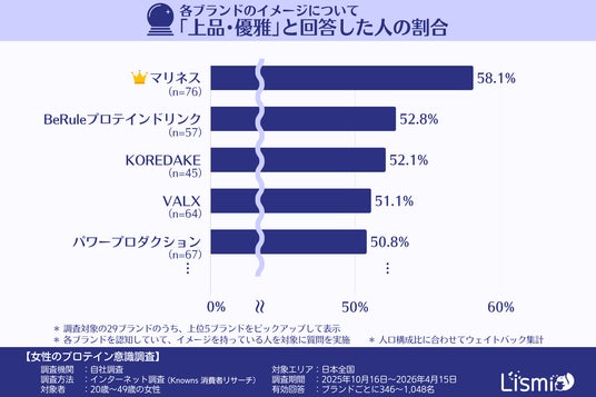 「上品・優雅」というイメージが当てはまると回答した割合は、『マリネス(mariness)』が58.1%で最も高く、2位の『BeRuleプロテインドリンク』(52.8%)と5.3ポイントの差となっています。3位以下は『KOREDAKE』が52.1%、『VALX』が51.1%、『スマートタンパク』が50.8%でした。