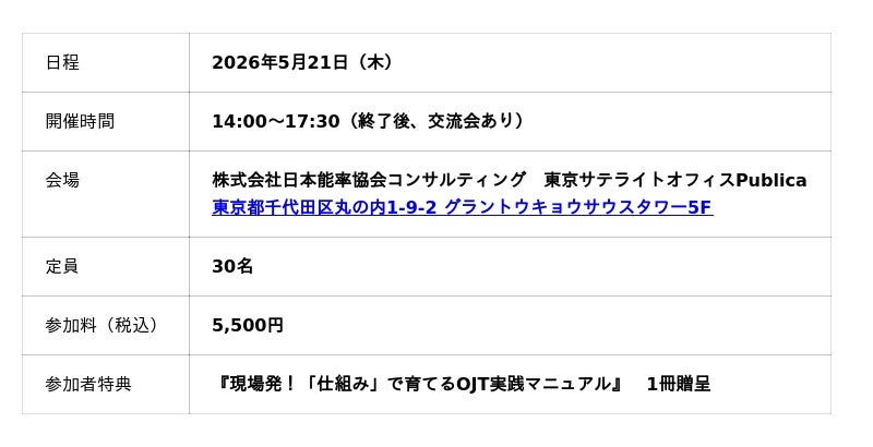 株式会社日本能率協会コンサルティング(本社:東京都港区・代表取締役社長:大谷羊平、以下JMAC)は、2026年5月21日(木)に、新刊『現場発!「仕組み」で育てるOJT実践マニュアル』の発刊を記念した特別セミナーを開催いたします。本セミナーは、労働力不足や熟練技能の継承といった現代の産業界が抱える課題に対し、個人の資質に頼らない「育つ仕組み」を構築するノウハウを共有するものです。著者が直接エッセンスを解説するほか、参加者同士の交流を通じて現場での具体的な実践度を高めるプログラムをご提供いたします。