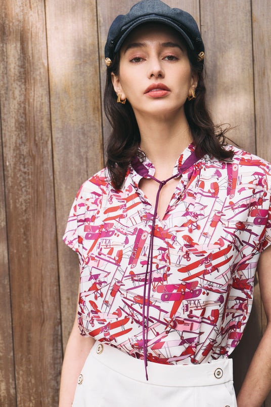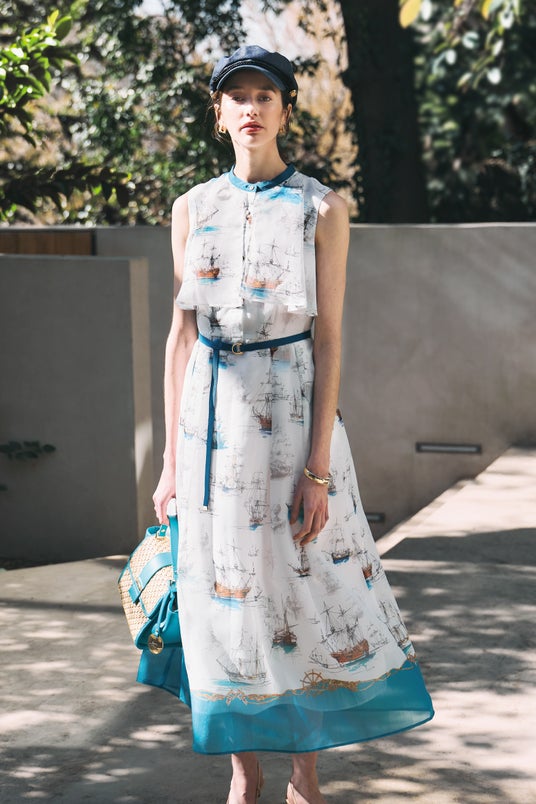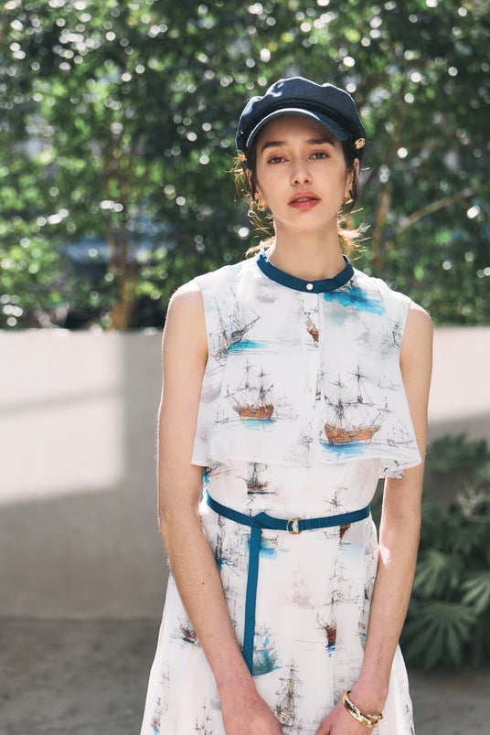 「何に乗って旅に出る?」をテーマにした新コレクションでは、京都のアトリエで描かれた舟旅プリントアイテムや、夏を楽しむエアリーなシアー素材を取り入れたスタイルをご提案します。クラシカルな帆船や飛行機のモチーフを使用したテキスタイルが、リゾートへの誘いを感じさせます。