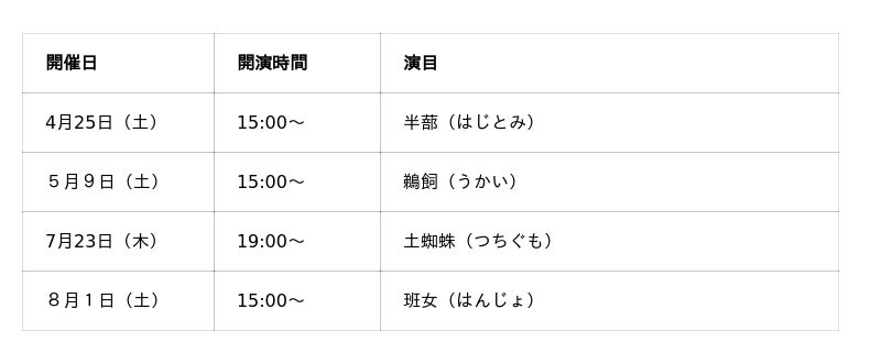 *プログラム詳細は公式ウェブサイトを参照ください。 https://www.noh-theater.com/schedule.php