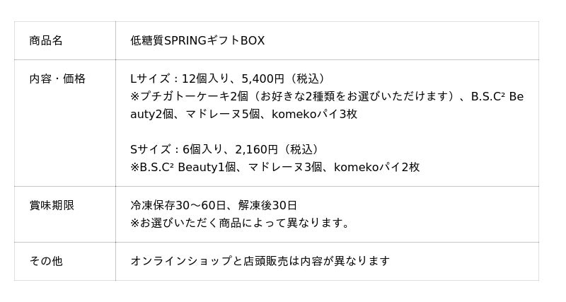 小麦・白砂糖を一切使用しない糖質10g前後(1個あたり)の低糖質な焼菓子とプチガトーケーキがセットになった特別な期間限定ギフトBOXです。