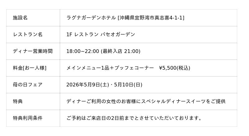 沖縄県宜野湾市のラグナガーデンホテル(株式会社 ラグナガーデンホテル)から母の日限定フェアとして2日前事前予約制で「1F パセオガーデン」のディナーご利用のお客様限定で目の前でフランベをする「ベイクドアラスカ・トロピカル」をご提供いたします。ディナーの締めくくりに目の前で仕上げる特別な一皿は、いつもお世話になっているお母様への素敵なプレゼントとして。五感で楽しみながら、「ありがとう」を伝えるのにぴったりな心あたたまる時間をお届けします。