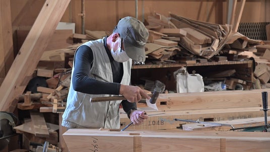 CADで設計されたデータに基づき、プレカット工場で材を加工します。最新鋭の自動機械による加工と併せて熟練の大工職人を配置。一般のプレカット工場で敬遠されがちな複雑な加工を大工職人が伝統の技でこなします。