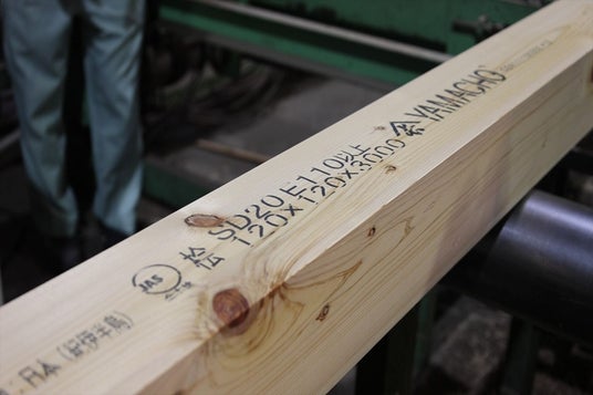 昔から「粘り強い」と言われてきた紀州材。これまで、和歌山県では紀州材(スギ・ヒノキ)の強さについて、調査研究を続けてきました。その結果、木材の強さを表すヤング係数が、ヒノキはE110、スギはE90と、一般的な同種の木材に比べて遥かに高く、また同等のヤング係数を持つ集成材と比べても個別の性能値が非常に高いことが証明されました。山長商店は2008年7月から国産杉平角JAS認定商品を販売しています。